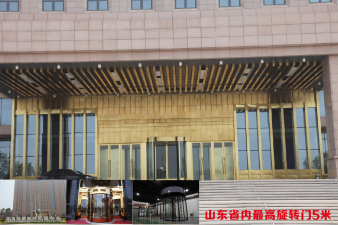 我公司为青岛董家口港办公大楼设计安装的超高异形旋转门总高度达到了5米,是目前山东地区最高的异形旋转门。青岛颐荣集团办公楼总高度为4.6米,佛山环球国际大厦总高度为4.2米。我公司已在全国各地区安装了多樘超高异形旋转门